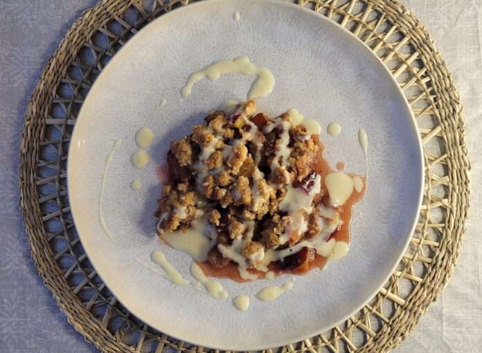 - Den Crumble mit Vanillesoße, Eis oder Sahne servieren.
