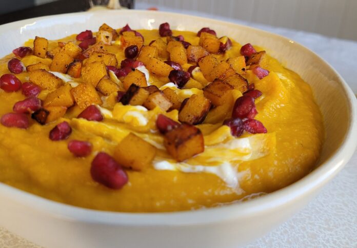 - Das Wasser und den Kümmel hinzugeben und alles für ca. 20 Minuten köcheln lassen, bis der Kürbis gar ist. Die Suppe fein pürieren. Mit Salz, Pfeffer und etwas Limettensaft abschmecken.