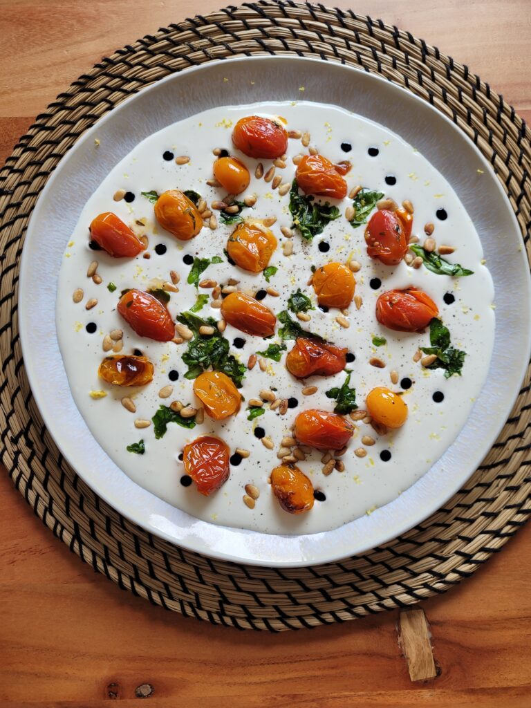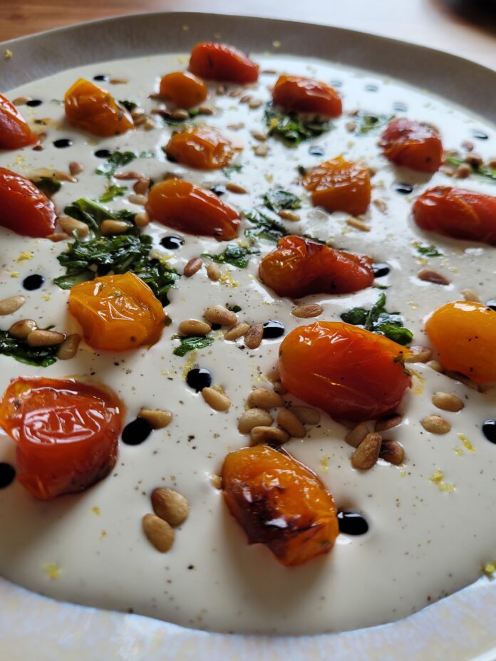 Jetzt nur noch die Creme und die Honigtomaten mit Pinienkernen, Balsamico-Creme und Basilikum anrichten und genießen.