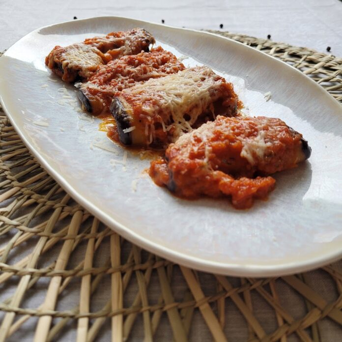 Aubergine längs in Scheiben schneiden, in Mehl wenden und in einer heißen Pfanne mit Olivenöl goldbraun braten. Anschließend die Auberginenscheiben auf einem Teller mit Zewa auskühlen lassen. Dann den Feta in Scheiben schneiden und auf die Aubergine legen und zusammen rollen. Anschließend die Tomatensoße in eine Auflaufform geben, die Röllchen darauf legen, mit Parmesan bestreuen und bei 180°C Umluft für ca. 20 Minuten in den Ofen geben.
