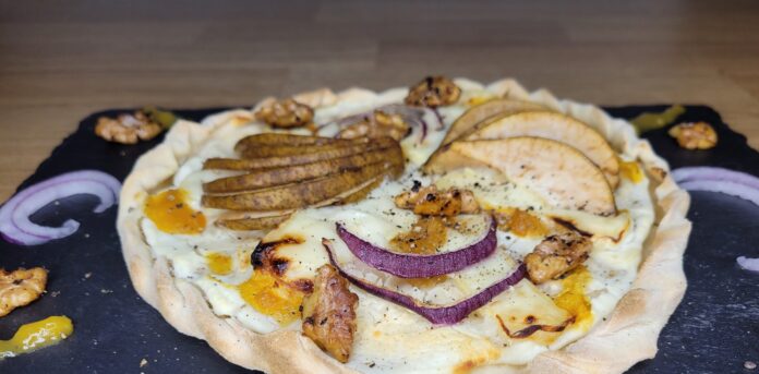 Flammkuchenteig ausrollen und im Ofen bei höchster Temperatur vorbacken. Bei leichter Bräunung rausholen und mit dem Ziegenfrischkäse bestreichen. Mit Ziegen-Camembert, Birnen und roten Zwiebeln belegen. Mit Salz und Pfeffer nach Belieben würzen.
